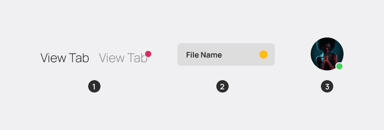 Badges are a small visual interaction with the user that aims to inform them of something, without using more than a colored dot. It should not be larger than 16 by 16 pixels. Optionally one can display a number but only in Notifier Badges, and text but only on Notifier and Modifier Badges.